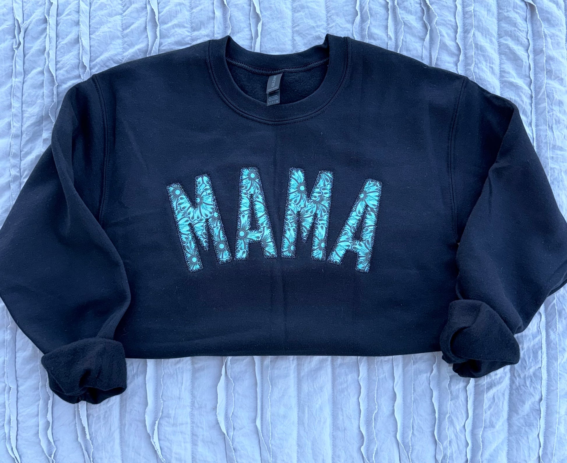This tooled leather fabric applique sweatshirt is perfect for all of the western Mamas!